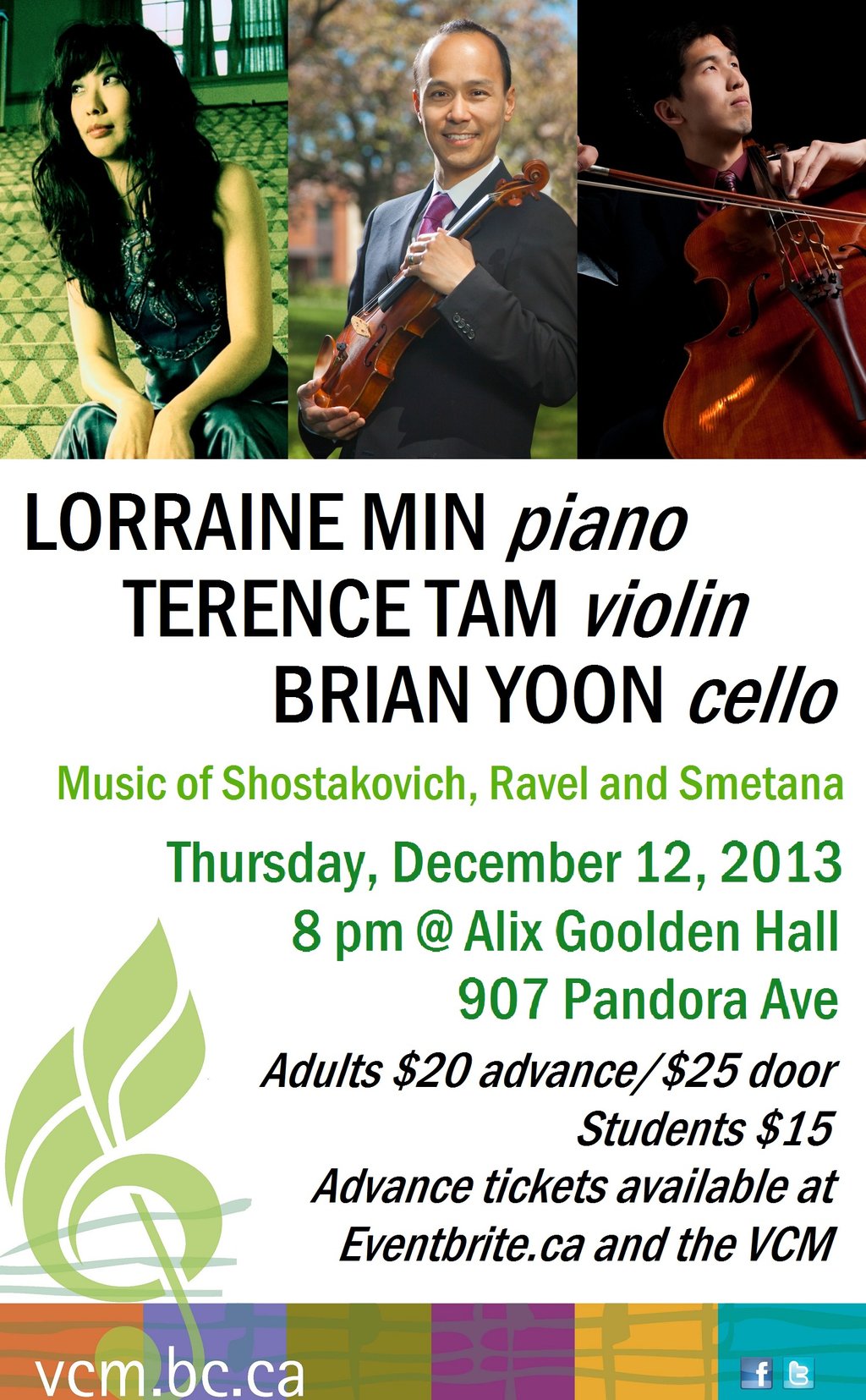 Lorraine Min (Steinway Artist), Terence Tam (Concertmaster, Victoria Symphony) and Brian Yoon (Principal Cello, Victoria Symphony) share the stage to perform works by Shostakovich, Ravel and Smetana. A concert not to be missed!