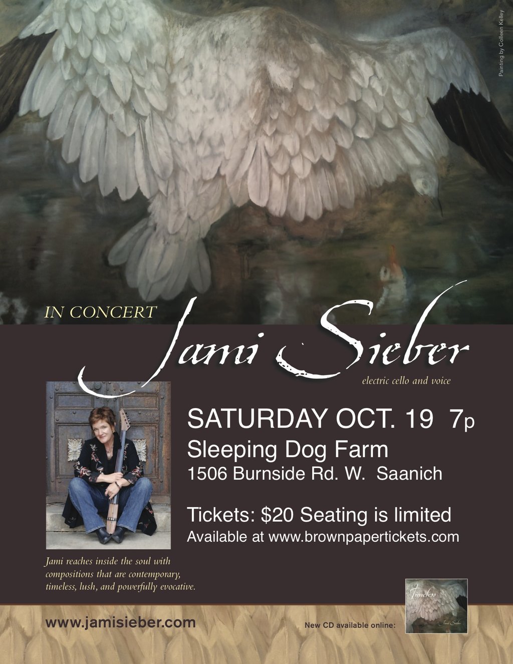 Electric cellist and vocalist Jami Sieber returns to Victoria to celebrate the release of her newest CD, Timeless. This newest work reaches inside the soul with compositions that are contemporary, lush, and powerfully evocative. Seating is limited to 40; Sleeping Dog Farm is located at 1506 Burnside Road West.