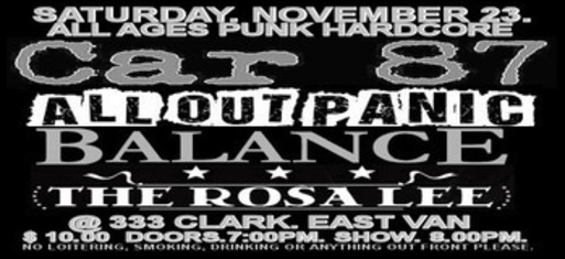 ALL AGES HARDCORE/PUNK:: Car 87, ALL OUT PANIC, Balance, THE ROSA LEE