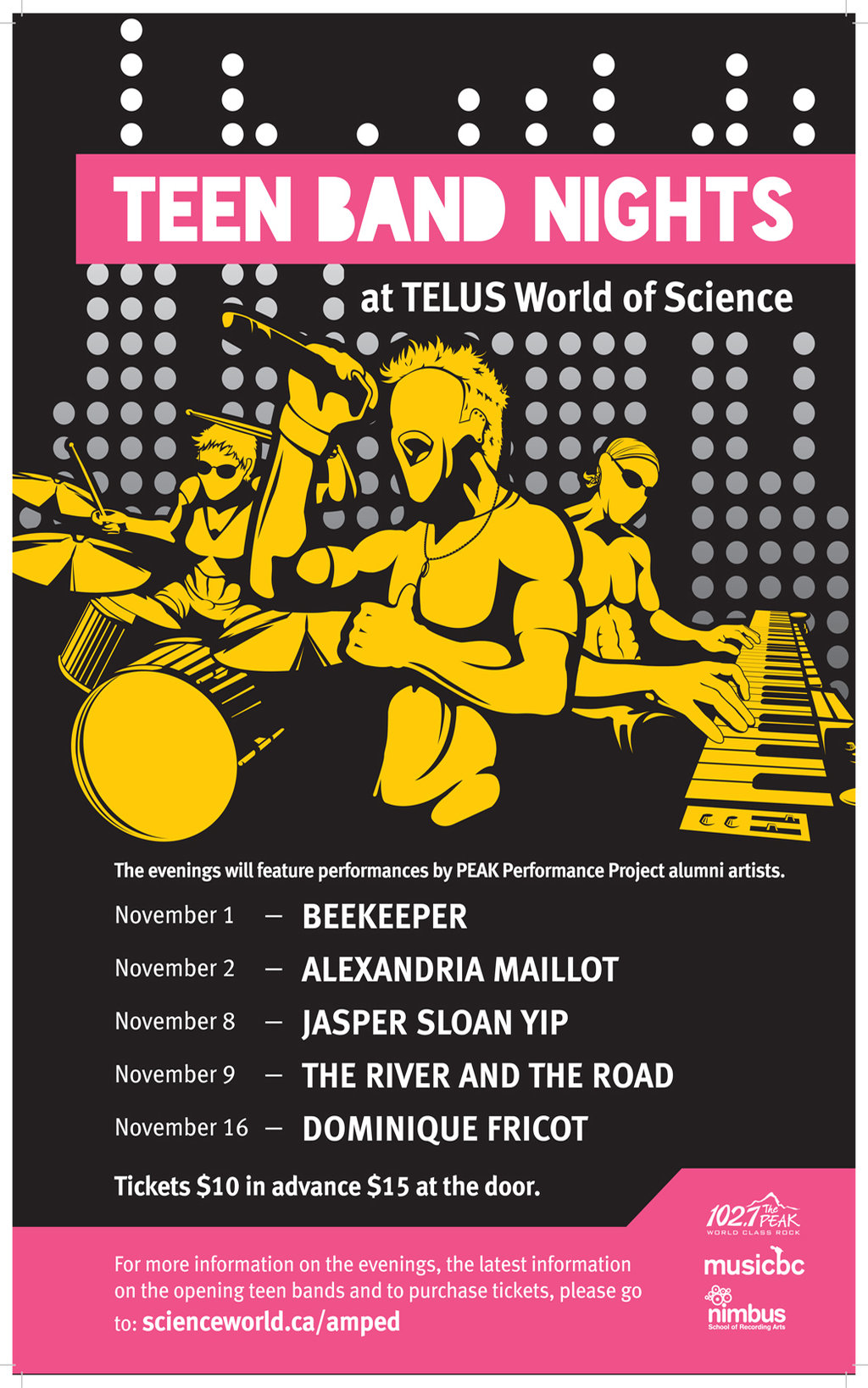 Science World, The PEAK Performance Project, The Peak 102.7, Music BC, and Nimbus School of Recording Arts are proud to announce the lineup for the finale AMPED! Teen Band Night.