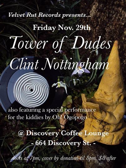 Velvet Rut Records presents an Intimate & Interactive performance by Victoria's finest 6-piece variety act The Tower of Dudes. Squeezing into the warm and cozy Discovery Coffee Lounge for your entertainment. They will be highlighting tracks off their upcoming full length LP as well as promoting a general enthusiasm for meaningful living.