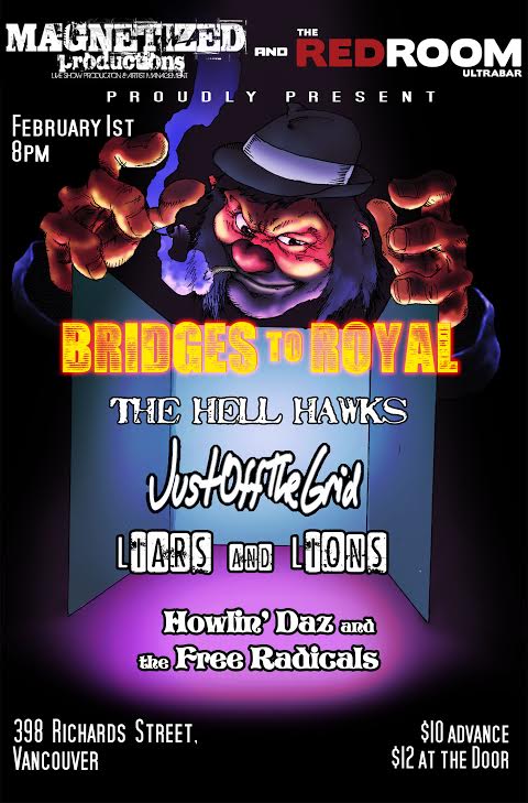 Magnetized Productions proudly presents: Bridges To Royal , Hell Hawks , Just Off The Grid , Liars and Lions , Howlin' Daz and The Free Radicals & Guest Saturday, February 1st at Red Room Ultra Bar, 398 Richards Street, Vancouver.. Tickets are $10 Advance / $12.00 at the door.