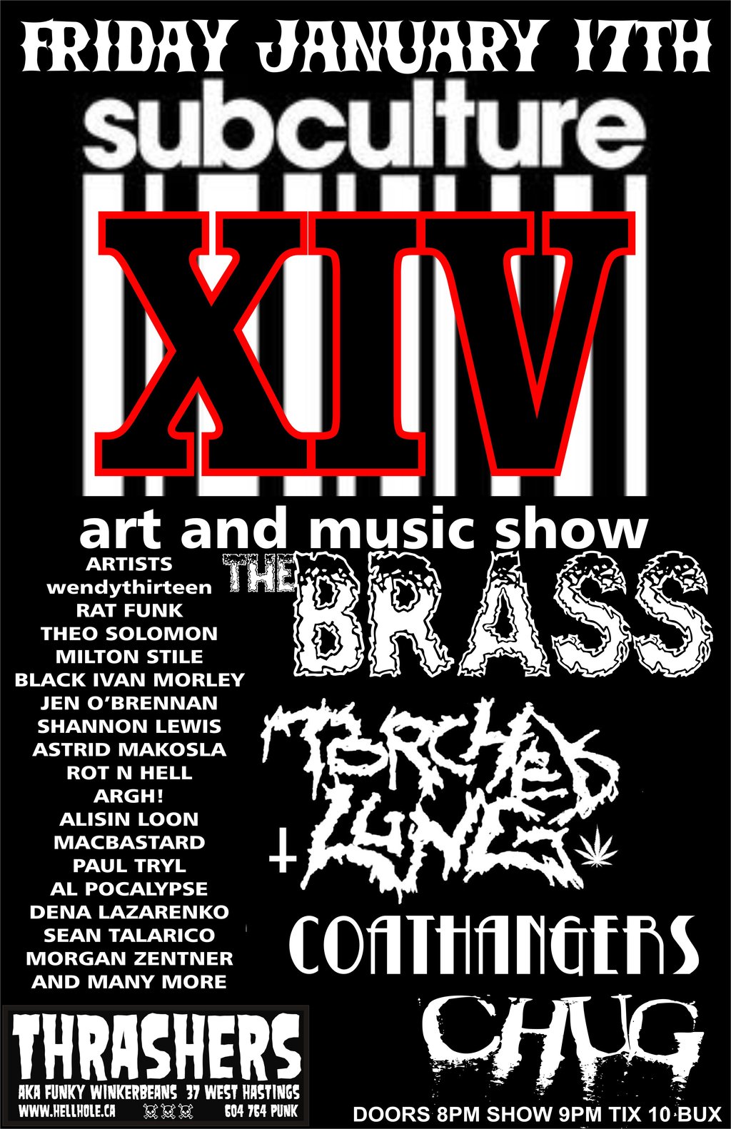 SUBCULTURE XIV - ART & MUSIC SHOW! BANDS! ARTISTS! VENDORS! TONS OF COOL CASH AND CARRY ODDITIES!: Brass, TORCHED LUNG, The Coathangers, Chug @ Funky Winker Beans Jan 17 2014 - Nov 23rd @ Funky Winker Beans
