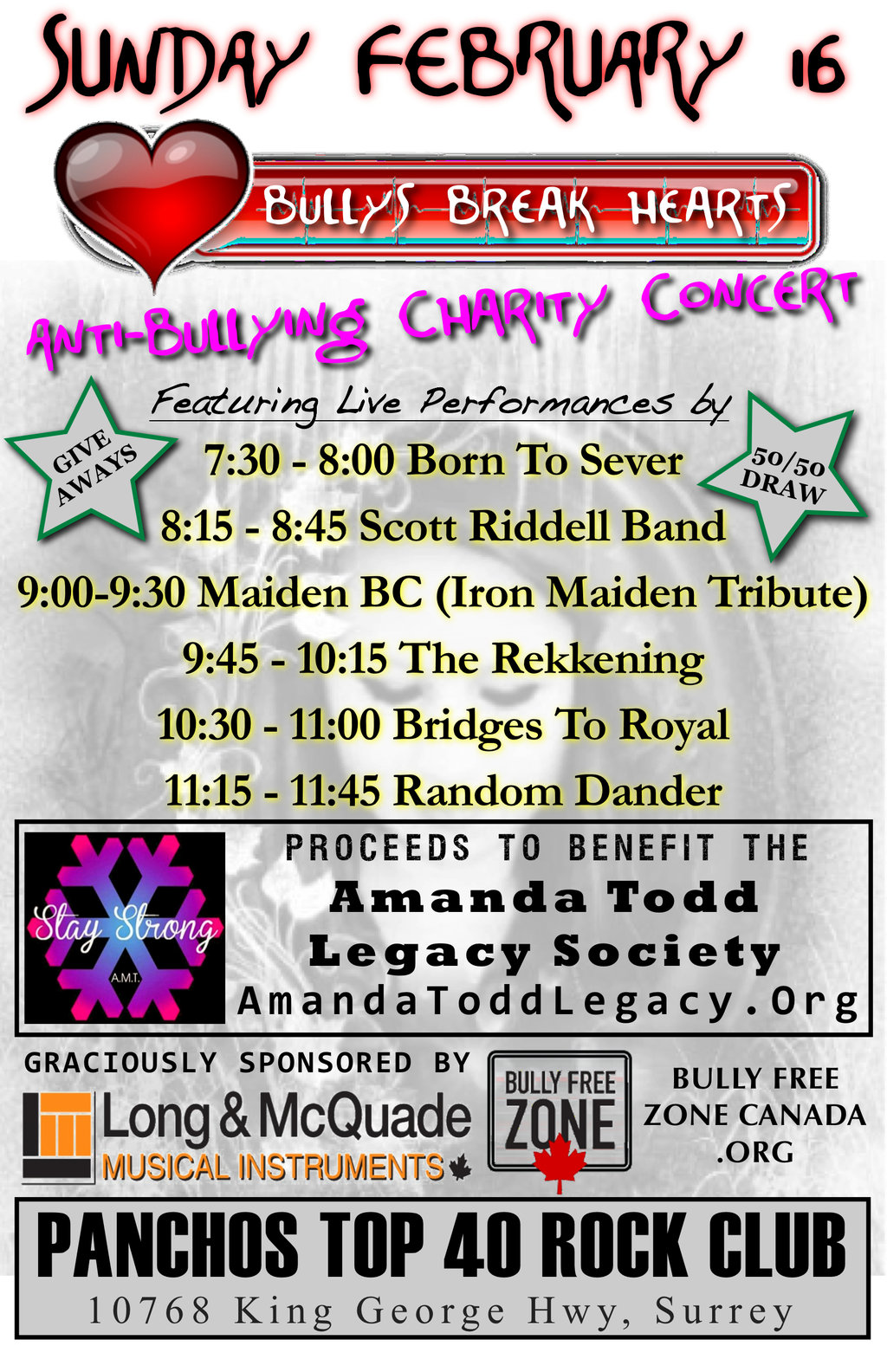 Bullys Break Hearts - Amanda Todd Legacy Society Fundraiser: Random Dander , Bridges to Royal, THE REKKENING, Maiden BC (Iron Maiden Tribute), Scott Riddell Band, Born To Sever