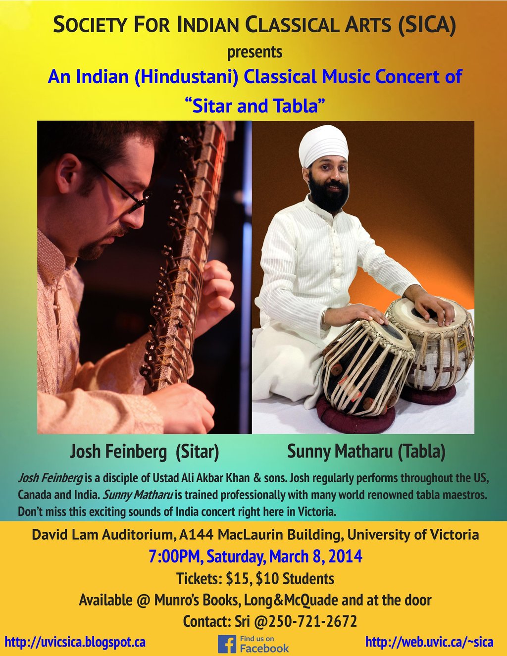 Society for Indian Classical Arts (SICA), a student club at University of Victoria is presenting an Indian (Hindustani) Classical Music concert of Sitar and Tabla on Saturday, March 8, 2014. Sitar is a plucked string instrument used mainly in Indian Classical music and Tabla is a pair of hand drums. Josh Feinberg is a disciple of Ustad Ali Akbar Khan and and sons will play Sitar in this concert with tabla accompaniment by Sunny Matharu. Don't miss this opportunity to see these wonderful artists perform here in Victoria.