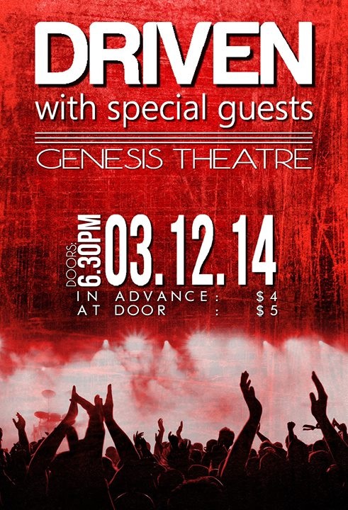 The local rock-band 'DRIVEN' is rocking the Genesis Theatre on March 12th! Doors open 6:30PM. Get your tickets for $5 at the door or in advance for $4 by emailing [email protected]!