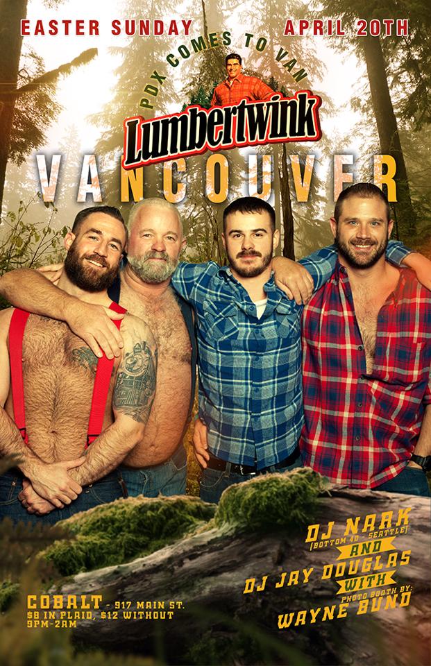 Special guest DJ from Seattle, NARK and Lumbertwink Portland photographer, Wayne Bund head up to East Van for a plaid, packed night! Van's own DJ Jay Douglas, go-go lumberjacks and 100s of furry faces will be on tap.