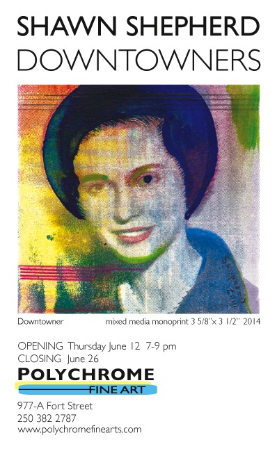 In his new exhibition titled Downtowners, Shawn Shepherd addresses thoughts on the anonymity of city living. He modifies discarded photo etched portrait plates from the local newspaper press, to reprint and colour them with disguises. The portraits of local, national and international celebrities become absorbed in a history of ideas and methods previously employed by the the artist.