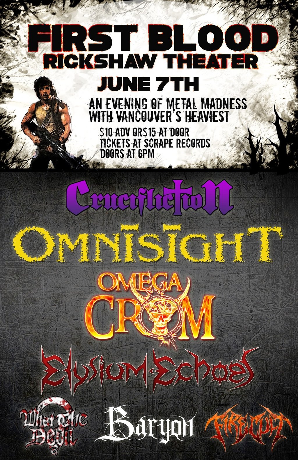 First Blood featuring: Omega Crom, Omnisight, Crucifliction, Elysium Echoes, Baryon, Firecult, WHAT THE DEVIL? @ Rickshaw Theatre Jun 7 2014 - Feb 5th @ Rickshaw Theatre
