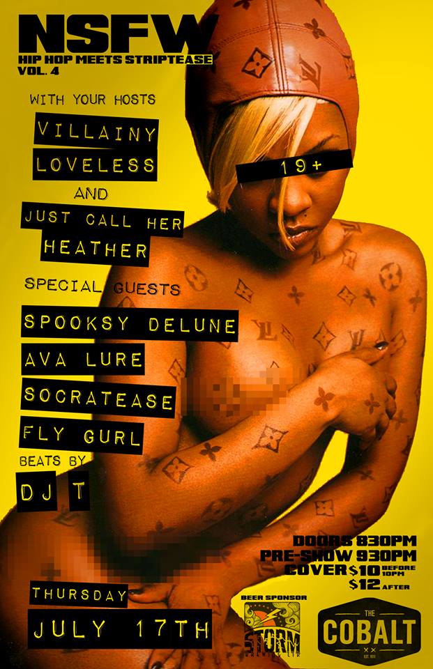 NSFW: Hip Hop Meets Strip Tease Vol 4. , Villainy Loveless, Just Call Her Heather , Spooksy DeLune, Ava Lure, Socratease, Fly Girl, Dj T, SPECIAL GUEST Boyfriend  (NOLA) @ The Cobalt Jul 17 2014 - Jan 2nd @ The Cobalt