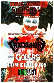 Powerclown is Dicksee Diànno(Lead vocs), Sketchy Clown(Lead Guit), Clive Burrito(Drums), Bruised Chickenskin(Lead Guit) and Steve Hairlips(Bass). The greatest tribute to one of the greatest bands of all time, IRON MAIDEN...These clowns have all the right stuff. With chops out the wazoo and enough charm to actually get hired for kids birthday parties, there's no telling what the future might bring for these surly middle-aged heavy metal harlequins. (let's just hope the future brings it soon...some of these jokers is running down the back stretch, know what i'm sayin'?)