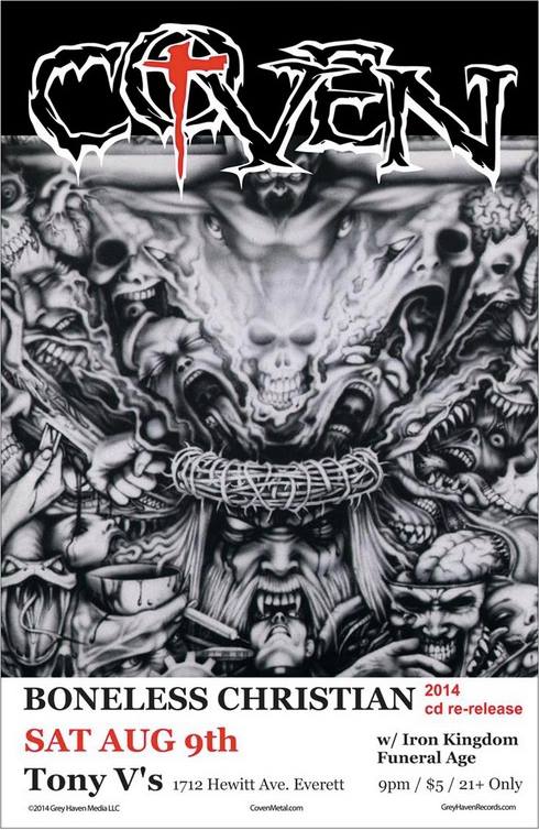 After 20 years COVEN will be re-releasing their 3rd album Boneless Christian!! The REMASTERED CD will feature a new layout, pictures and will include the BONUS TRACK: "I'm a Comin'" recorded during the Boneless Christian sessions.