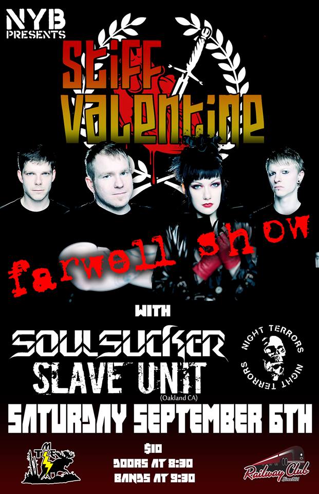 After over 10 yrs, tonnes of shows, several tours and a few albums Vancouver's Stiff Valentine are hanging up their spurs and are on the road to other ventures ... but before they do they're hitting the highways and booking a fond farewell tour with this being the final stop, a grand finally on home turf with a line up comprised of some dear friends ... tour mates from Oakland Slave Unit and with Soulsucker, 88 Mile Trip and Nightterrors. damn this is gonna be amazing!