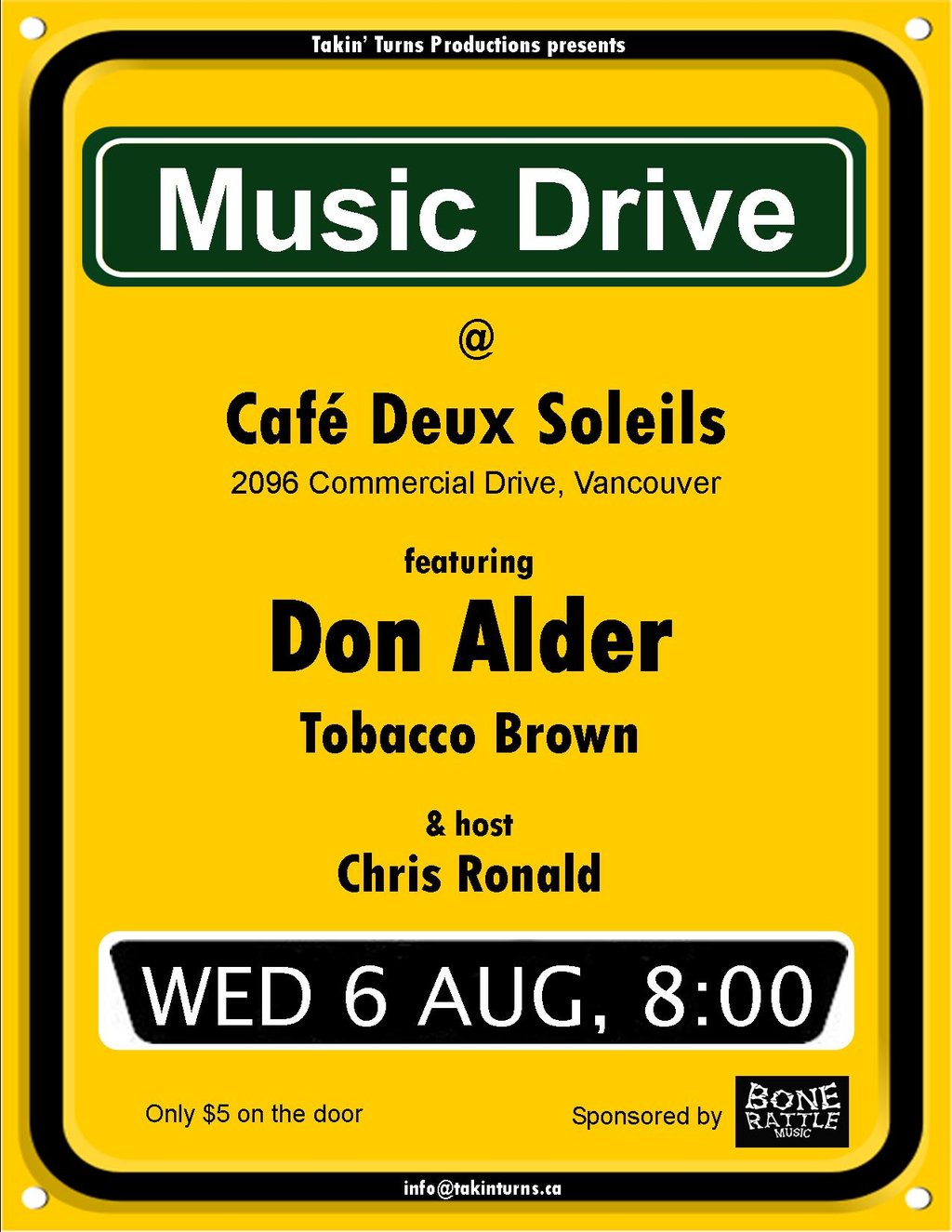 Music Drive: Don Alder, Tobacco Brown, Chris Ronald (Host) @ Cafe deux Soleils Aug 6 2014 - Dec 4th @ Cafe deux Soleils