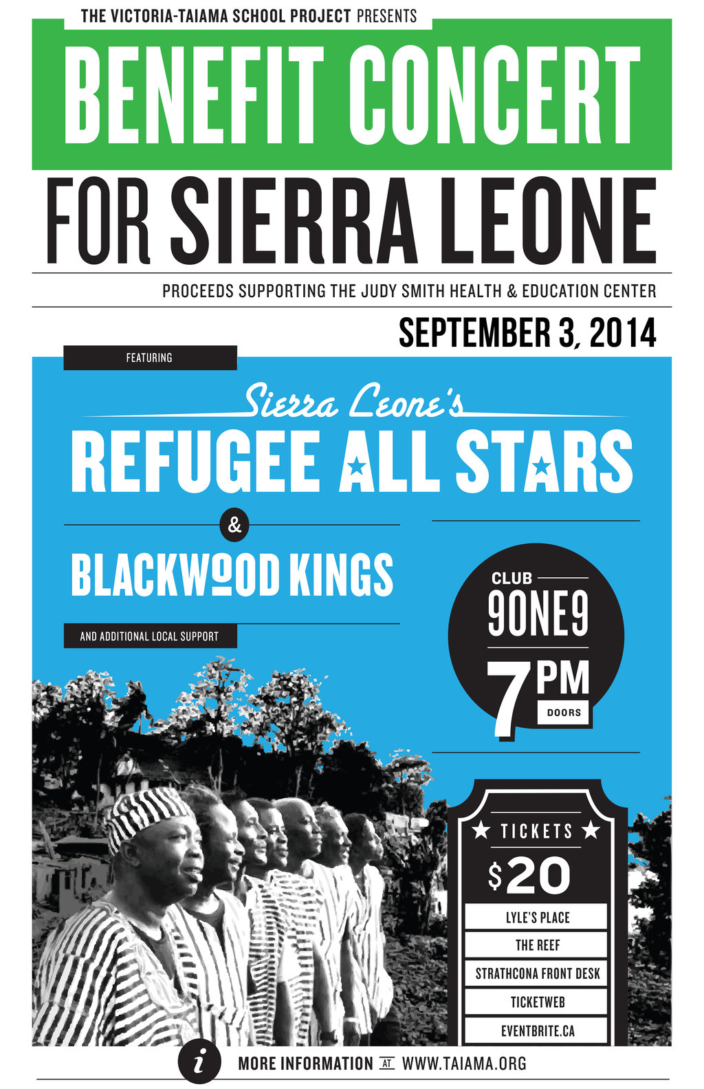 The Victoria-Taiama School Project Presents:Benefit Concert for Sierra Leone featuring Sierra Leone's Refugee All Stars Wednesday, September 3, 2014 at Distrikt (formerly Club 9ONE9)