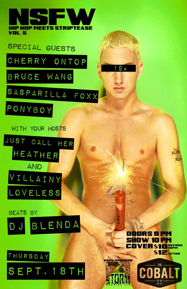 NSFW ~ NOT SAFE FOR WORK ~ Hip Hop Meets Striptease Vol.5: Just Call Her Heater, Villainy Loveless, Cherry On Top, Sasparilla Foxx, Bruce Wang , Pony Boy, DJ Blenda, Venus Envine @ The Cobalt Sep 18 2014 - Jan 2nd @ The Cobalt
