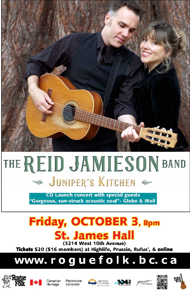 Rogue Folk presents Reid Jamieson > cd release for Juniper's Kitchen - Reid's 1st record with the missus! Tickets $20 (no service fees) on sale now http://roguefolk.bc.ca/concerts/ev14100320 > 2 sets with special guests. doors 7pm, show 8pm. LISTEN NOW: https://soundcloud.com/reidjamieson/sets/juniperskitchen