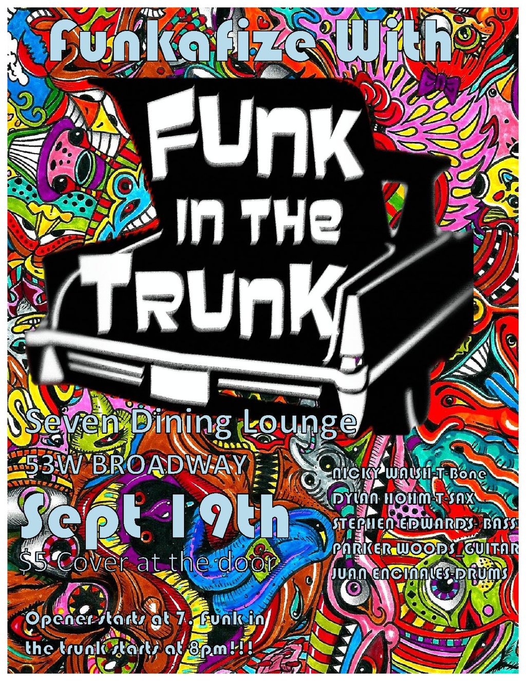 Get your funk on with Funk in the Trunk Friday Sept. 19th at the Seven Dining Lounge. The group features Nicholas Walsh - Trombone, Dylan Holm - Saxaphone, Parker Woods - Guitar, Stephen Edwards - Electric Bass, and Juan Encinales on drums! Enjoy some covers of your favourite tunes by Average White Band, Joe Henderson, and much more, including funky covers of jazz standards! $5.00 minimum cover at the door.