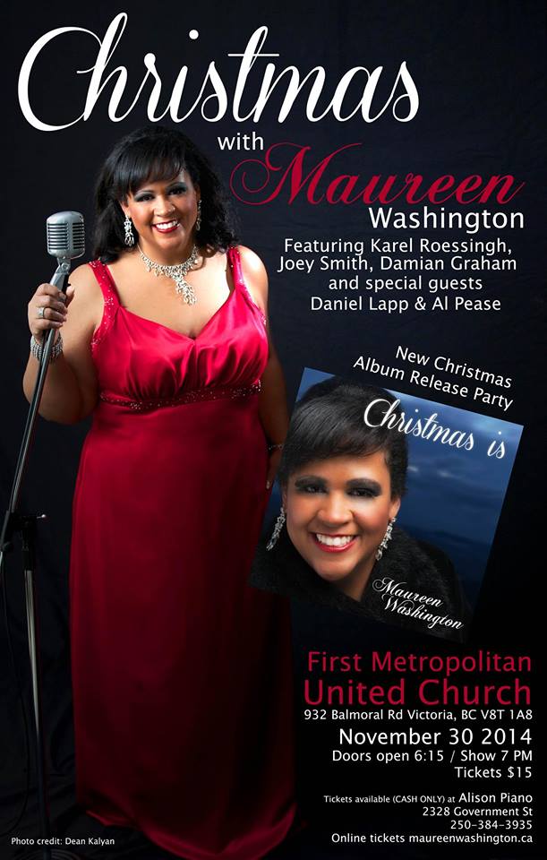 celebration of timeless classics relived with a fresh feel. The title track, written by Percy Faith, will set the mood for an evening of great music. Come out and celebrate the joys of the season with Maureen Washington and her stellar band including Karel Roessingh, Damian Graham, Joey Smith and special guests Daniel Lapp and Al Pease. You’ll be glad you did. Tickets are available at Alison Piano 2328 Government Street Victoria (cash only) or online at http://tinyurl.com/MW-Concert-Tickets