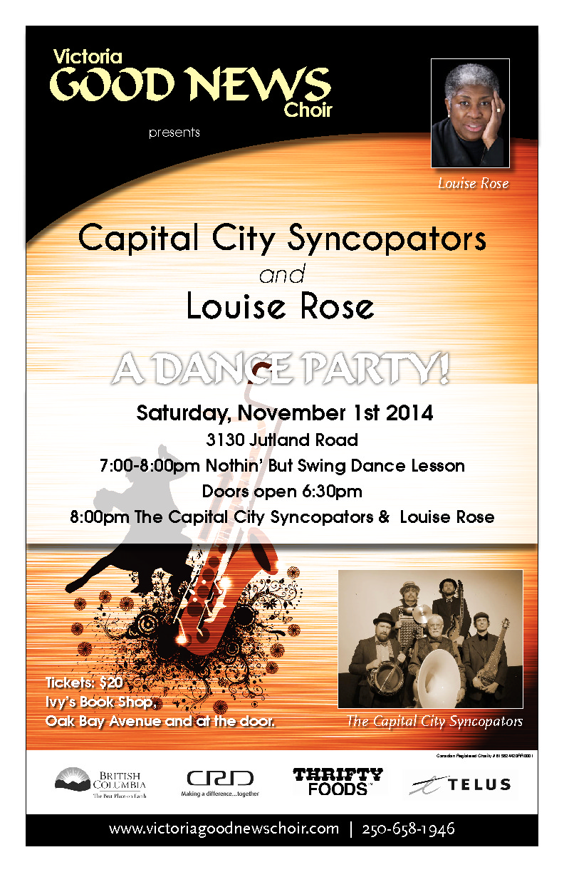 “Nothing But Swing”, Victoria’s swing dance society and The Victoria Good News Choir are co-hosting a dance party on Saturday, November 1, 2014 at The Gorge Burnside Community Centre. Live music by the Capital City Syncopators with special guest Louise Rose. DJ on the breaks for an evening of uninterrupted dance music. Put on your dancing shoes; grab your partner or, better still… come on your own… and find a partner. Beginner Lesson starts the party and you can dance the night away.