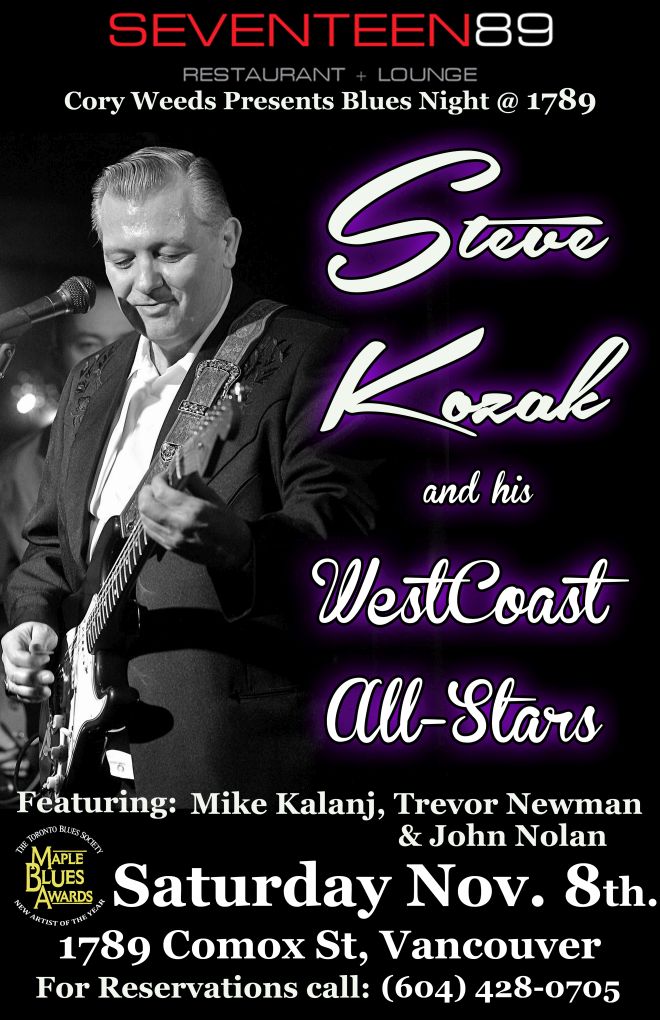 Maple Blues Award Winner Steve Kozak and his WestCoast All-Stars perform at 1789. $10 admission... $20 min. per table. 1789 Comox St. For reservations call: (604) 428-0705