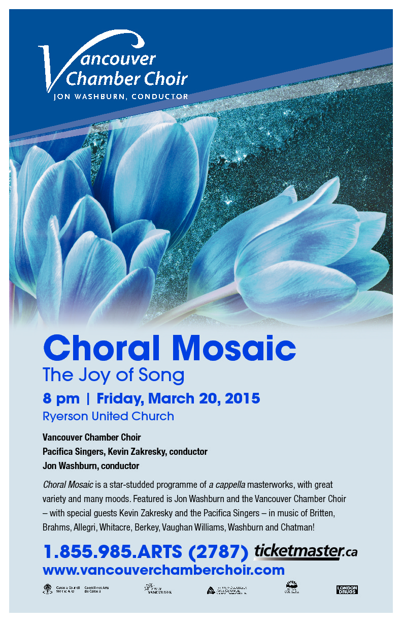 CHORAL MOSAIC The Joy of Song: Vancouver Chamber Choir, Jon Washburn (conductor), Pacifica Singers, Kevin Zakresky  (conductor) @ Ryerson United Church Mar 20 2015 - Jan 11th @ Ryerson United Church
