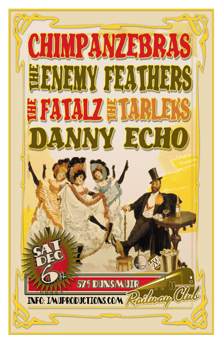 . Saturday, Dec 6th IMU presents CHIMPANZEBRAS, ENEMY FEATHERS, The FATALZ, The TARLEKS & DANNY ECHO @ The Railway Club, 579 Dunsmuir . 9:30pm / $10 cover
