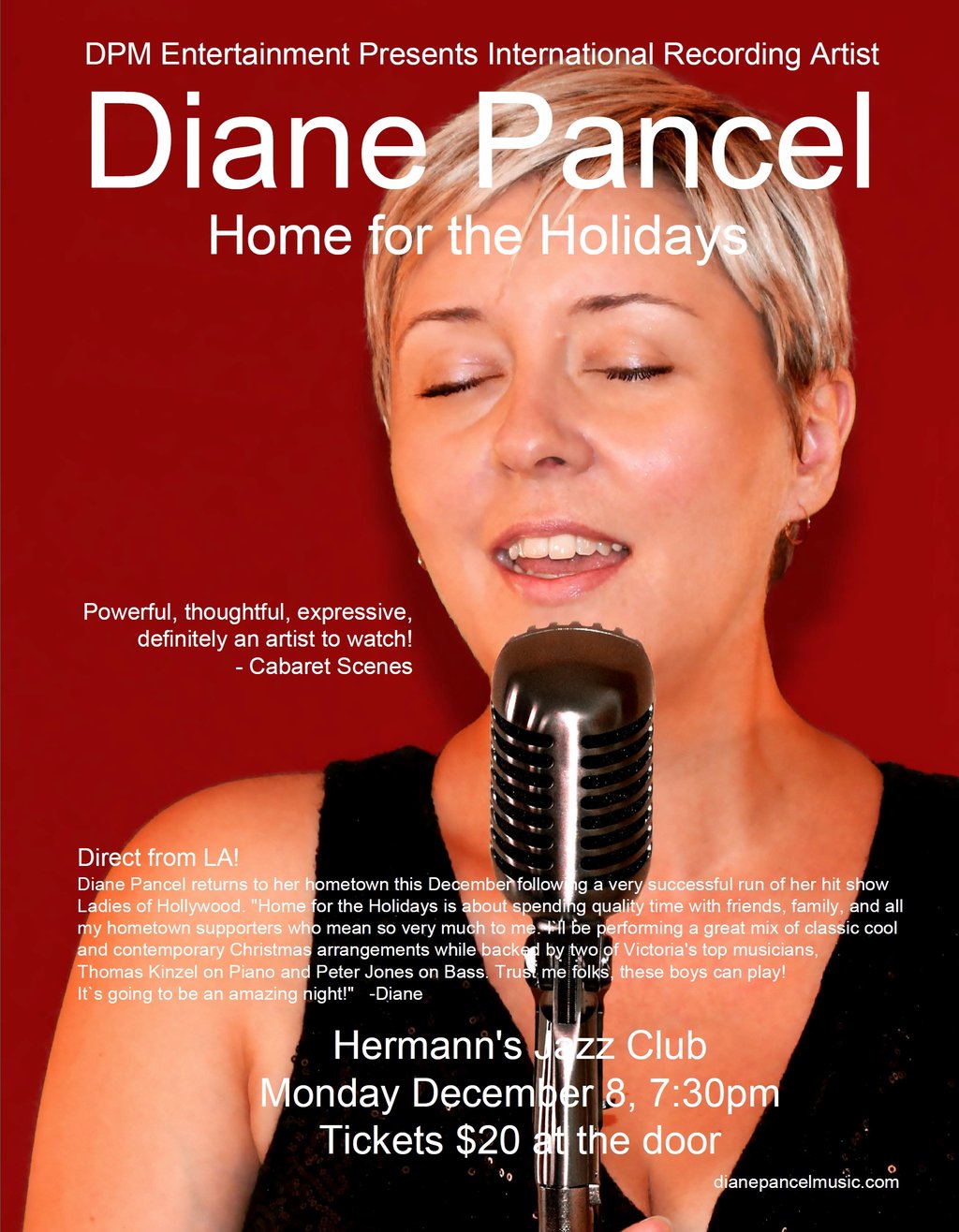 Diane Pancel is returning to her hometown this December following a very successful run of her hit show Ladies of Hollywood. Home for the Holidays is about spending quality time with friends, family, and all my hometown supporters who mean so very much to me. I`ll be performing a great mix of classic cool and contemporary Christmas arrangements while backed by two of Victoria's top musicians, Thomas Kinzel on Piano and Peter Jones on Bass. Trust me folks, these boys can play! It`s going to be an amazing night. -Diane