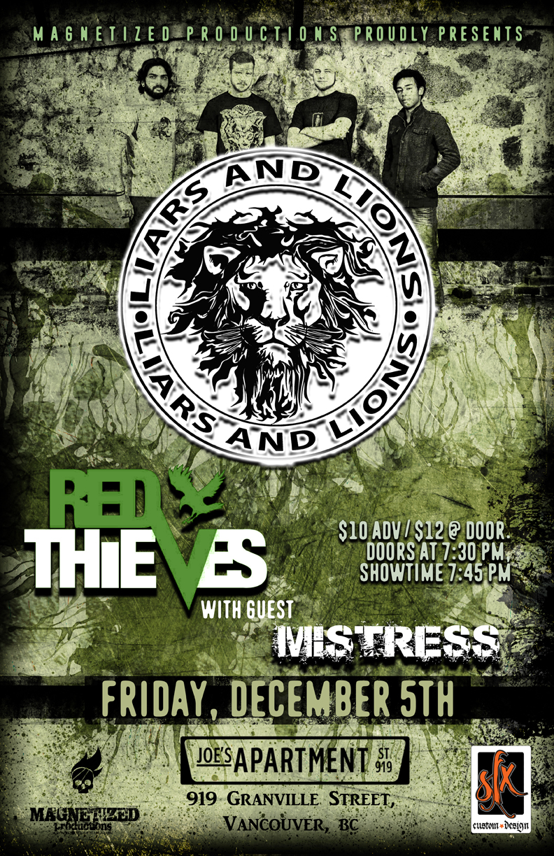 Magnetized Productions Present: Liars and Lions, Red Thieves with Guest Mistress.. Friday, December 5th at Joe's Apartment, 919 Granville Street, Vancouver. $10 Adv / $12 @ Door. Doors at 7:30 pm, Showtime 7:45 pm