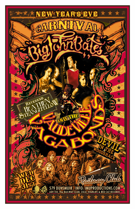 . Wednesday, December 31st IMU presents NEW YEAR'S CARNIVAL! BIG JOHN BATES, REVEREND HEATHEN STRANGEFELLOW & The VAUDEVILLE VAGABONDS + DEVIL IN THE WOOD SHACK @ The Railway Club, 579 Dunsmuir . Show 9pm sharp! / $20 door / $15 adv tickets @ Railway Club, High Life, Zulu, Red Cat Records & http://northerntickets.com/events/new-years-carnival
