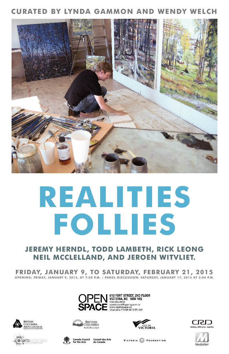 Realities Follies surveys the work of five Victoria based painters; Jeremy Herndl, Todd Lambeth, Rick Leong, Neil McClelland, and Jeroen Witvliet. Curators Lynda Gammon (UVic Visual Arts Department) and Wendy Welch (Vancouver Island School of Art) observe: “We live in an image-world. Selfies on Facebook, instant sharing on Instagram, and photo albums on Flickr, all demonstrate our intense desire to re-present our world. Through the practice of painting, the artists in this exhibition, each in their own way, are re-presenting and interrogating the meaning of representation, and in turn, questioning our ways of perceiving reality.”