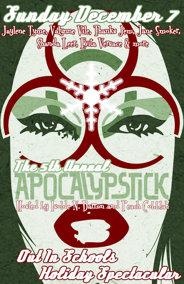 The 5th Annual APOCALYPSTICK Holiday Spectacular for Out in Schools!: Isolde N Barron, Peach Cobblah, Valynne Vile, Jaylene Tyme, Pony Boy, Thanks Jem, Jane Smoker, Anna Propriette, Shanda Leer, Evita Versace @ The Cobalt Dec 7 2014 - Jan 2nd @ The Cobalt