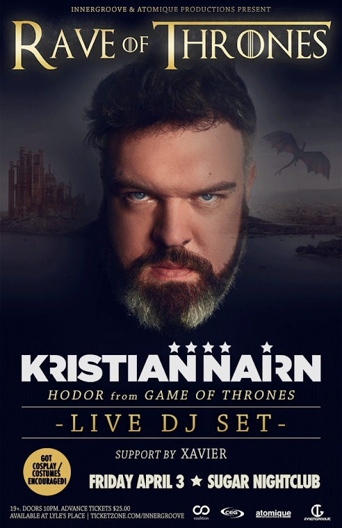 Winter is coming April 3rd to Sugar NightClub! Join us as Kristain Nairn aka HODOR's world Rave Of Thrones tour touches down in Victoria. Come dressed in your best Westeros and Essos attire!