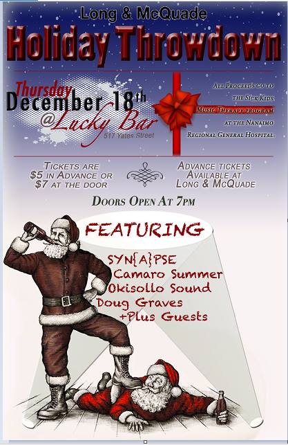 This year's Long and McQuade Holiday Throwdown is shaping up to be a good one! Come join us at Lucky Bar for a night of great music courtesy of SYN{A}PSE, Camaro Summer, Okisollo Sound, Doug Graves, and more. All proceeds from tickets go to the Music Therapy Program at Nanaimo General Hospital, so come party for a great cause!