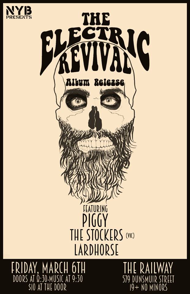 CowTown's hard hitting rocknroll juggernauts The Electric Revival have just dropped their 3rd feature full length 'FREAKS' and are taking the country by storm ... don't miss these larger than life riff machines rip the Railway apart with local punk'n'roll champs PIGGY and our good buds from Vic, The Stockers!!! AND an opener i'm very excited about ... the facefest band that stole the show Lardhorse!!!