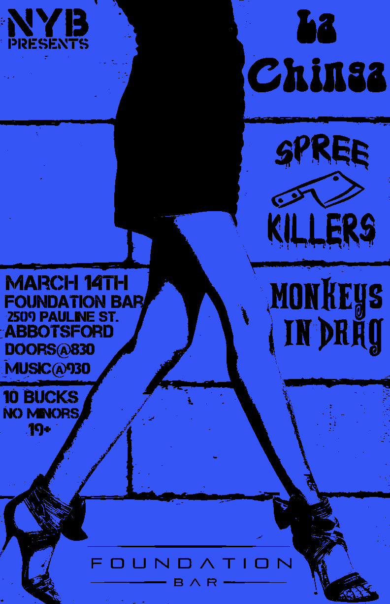 yo stAbby people ... it's Zach's BDAY which means his highly hated Monkeys in Drag are gonna play and we're gonna have a couple other killer bands back out!!! female fronted punk rock powerhouse SPREE KILLERS and the mighty La Chinga!!!