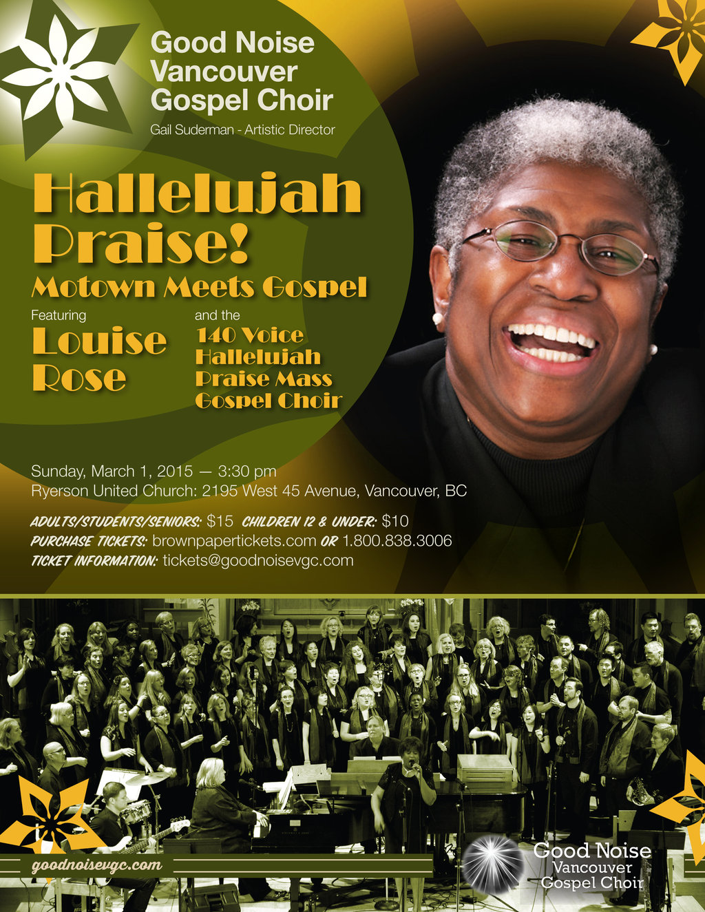Good Noise Vancouver Gospel Choir get their soulful groove on with Hallelujah Praise: Motown Meets Gospel – Sunday, March 1, 2015, 3:30pm at Ryerson United Church (2195 W. 45th Avenue). The annual concert – an audience favorite – promises to raise spirits with upwards of 140 glorious voices singing works that combine smooth R&B rhythms of the Motown tradition with stirring gospel selections. This is a timely performance, falling closely behind Canada’s Black History Month, and will feature songs by acclaimed artists who brilliantly merge the two influential and celebrated genres.
