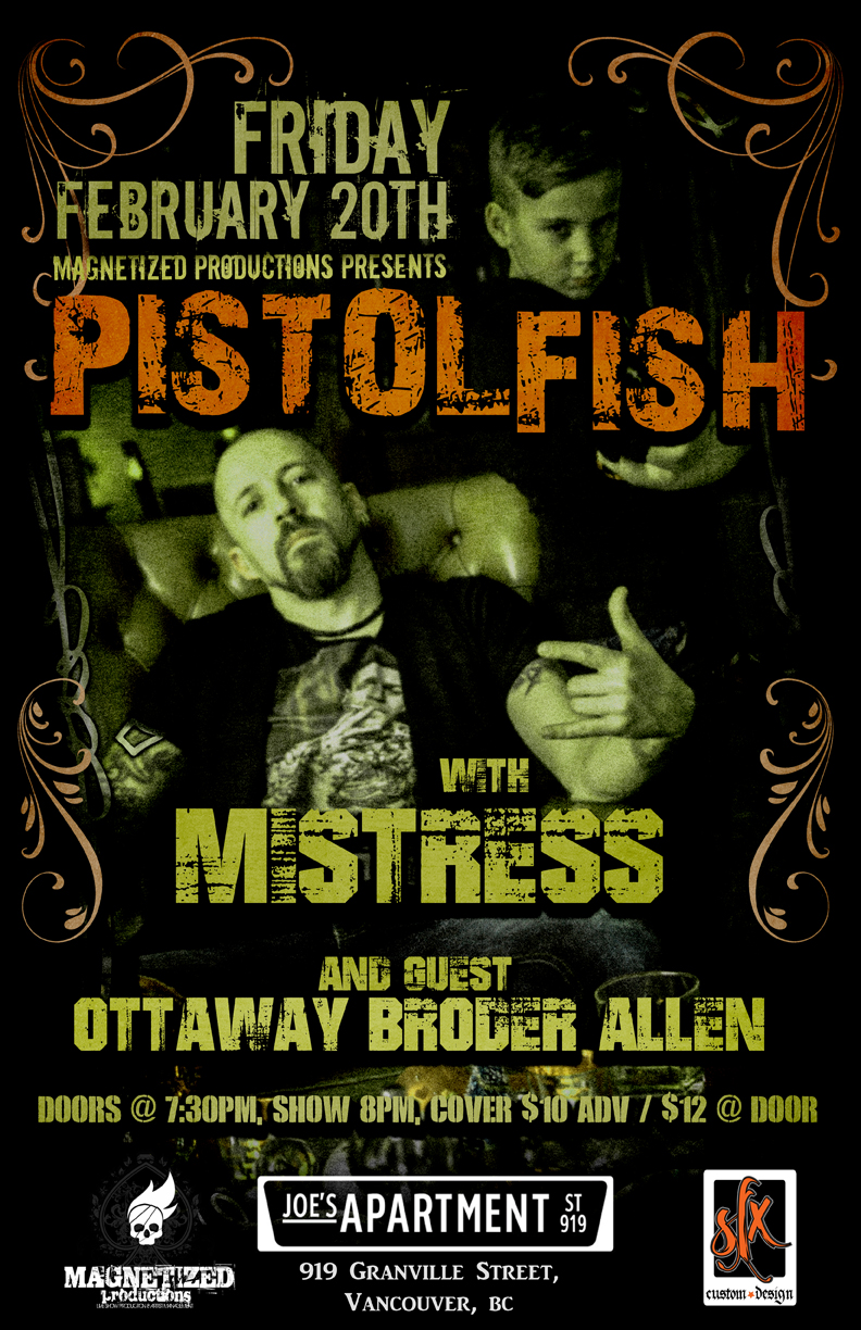 Magnetized Productions Present: Pistolfish with Mistress and Guest Ottaway, Broder, Allen. Friday, February 20th at Joe's Apartment, 919 Granville Street, Vancouver. Doors @ 7:30pm, Show 8pm, Cover $10 Adv / $12 @ Door