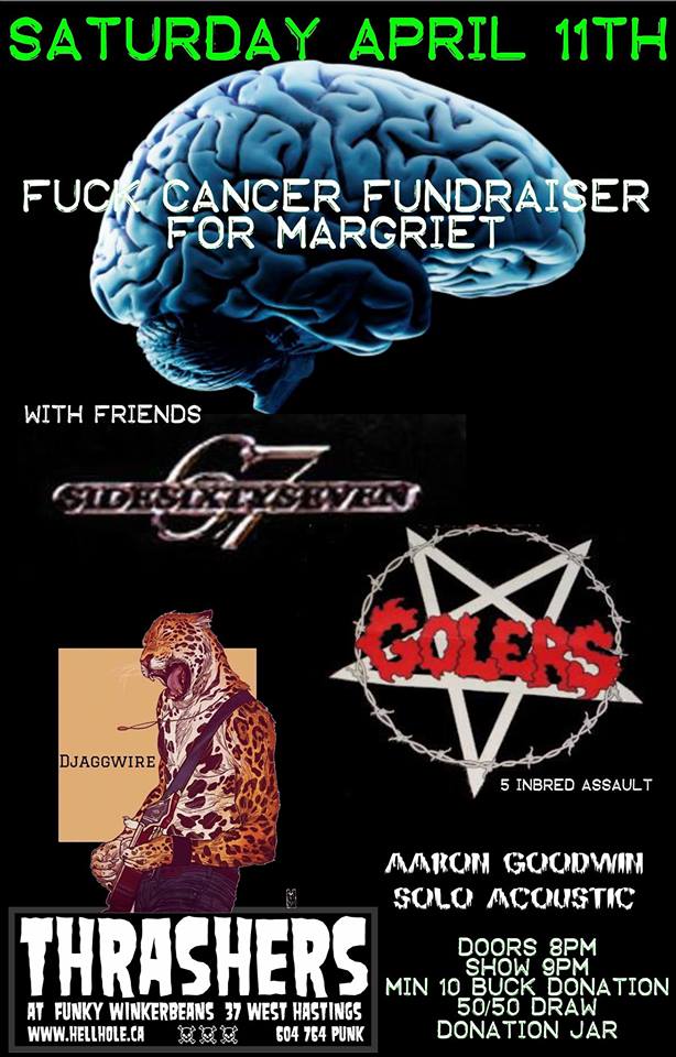FUNDRAISER TO HELP GEOFF GOLER'S WIFE MARGRIET GET THE ALTERNATIVE MEDICATIONS SHE NEEDS TO FIGHT HER BRAIN CANCER... CHEMO ISN'T AN OPTION AT THIS STAGE ... AND THESE SPECIALIZED MEDICATIONS ARE NOT COVERED BY MSP... GLIOBLASTOMA MULTIFORME.... 11 YEARS ... 3 BRAIN SURGERIES .... WHAT A FIGHTER!