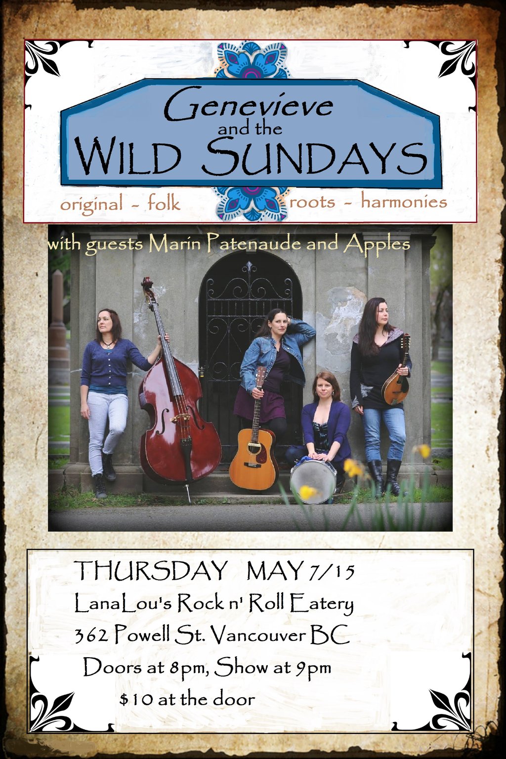 Soaring harmonies, catchy songs, original folk-roots music: this is Genevieve and the Wild Sundays. The all-female quartet, featuring the award-winning songs of Vancouver-Island-based homesteading mama Genevieve Charbonneau, will be making their first visit to Vancouver, with a concert at LanaLou's on May 7. Opening the show will be vocalist and guitarist Marin Patenaude, and closing up the night will be heart-felt rock n' roll musician Apples.