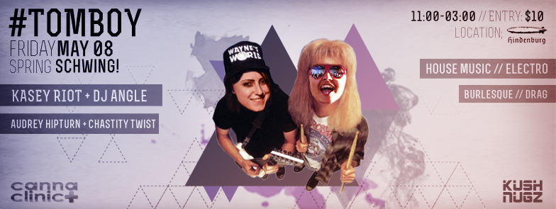 Get in the Mirth Mobile! Spring has sprung and #TOMBOY is rocking out at The Hindenburg with a totally radical line-up of babes that'll make you feel funny in the pants like when you climbed the rope in gym class, contests that'll make you spew and tubular jams with your best bro DJs KASEY RIOT + DJ ANGLE. Performances by foxy ladies CHASTITY TWIST & Ottawa's AUDREY HIPTURN ---> SCHWING!!!