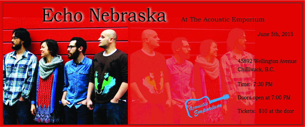 Indie folk-rockers, Echo Nebraska will be playing the Acoustic Emporium in Chilliwack on June 5th. Tickets are $10 at the door when they open up at 7:00pm.