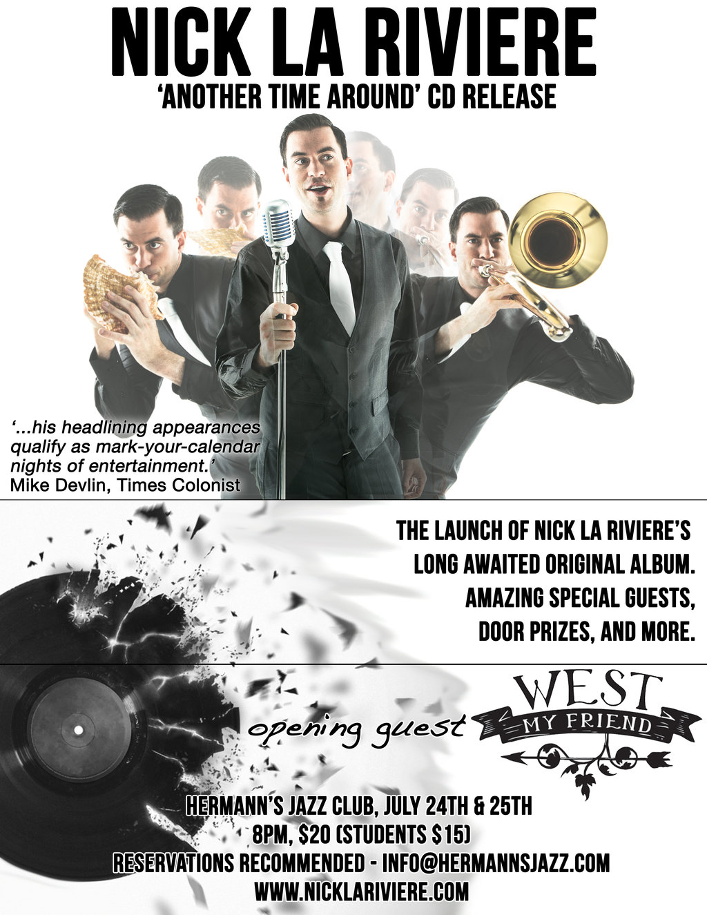 Composer, arranger, performer, singer, trombonist, band leader, conch shell player, bass player: Nick La Riviere is already well known in many circles as one of BC’s busiest musicians. As a sideman, Nick has performed with award winning artists of many genres - Michael Kaeshammer, Nikki Yanofsky, The Temptations, Adonis Puentes, The Paperboys, to name a few. He regularly plays R&B, folk, funk, latin, klezmer, jazz, pop; pretty much everything. Nick’s musical travels have taken him all over Canada, the USA, and as far as Germany, Switzerland, England, Ireland, Luxembourg, Mexico, and more. He also teaches a 16 piece R&B band, leads a few bands of his own, and performs often on a nightly basis.