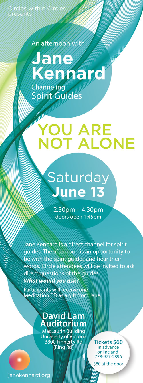 Cost: Tickets: $60 in advance available online Buy Now http://www.janekennard.org/product/you-are-not-alone-circle-tickets-saturday-june-13-2015/ Or call 778-977-2896 to order tickets by phone. And buy tickets in advance in-person at: Instinct Art & Gifts 622 View St Victoria, BC V8W 1J4 250-388-5033 Website http://www.instinctartandgifts.com/ Find the store here https://www.google.ca/maps/dir/''/The+Bay+Centre,+622+View+St,+Victoria,+BC+V8W/@48.4256091,-123.3709504,16z/data=!3m1!4b1!4m8!4m7!1m0!1m5!1m1!1s0x548f749acf1f508b:0xcefc65c89e557870!2m2!1d-123.3666589!2d48.4256092 Tickets $80 at the door.