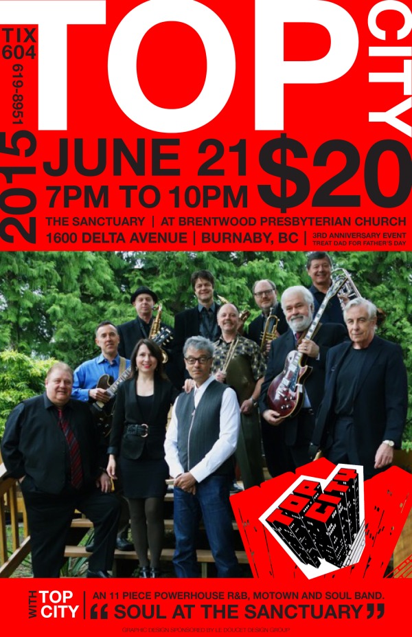 Help Top City celebrate their 3rd year together AND Father’s Day all on the same day with a jam packed concert full of tasty arrangements from groups such as Chicago, Earth Wind & Fire, Blood Sweat & Tears, Bonnie Raitt, Nicolette Larsen, Dusty Springfield and more!