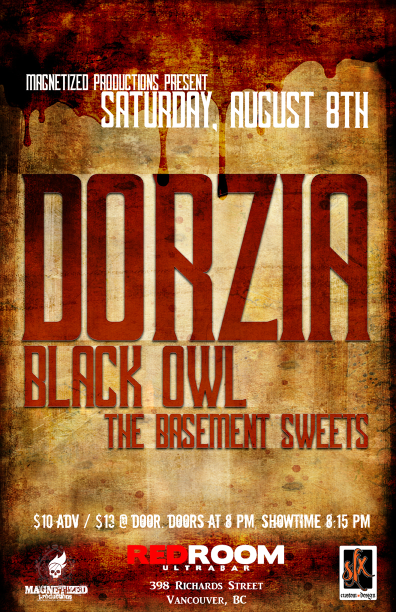 Magnetized Productions Present: Dorzia with Black Owl and The Basement Sweets. Saturday, August 8th at Red Room Ultra Bar, 398 Richards Street, Street, Vancouver. $10 Adv / $13 @ Door. Doors at 7:30 pm, Showtime 7:45 pm