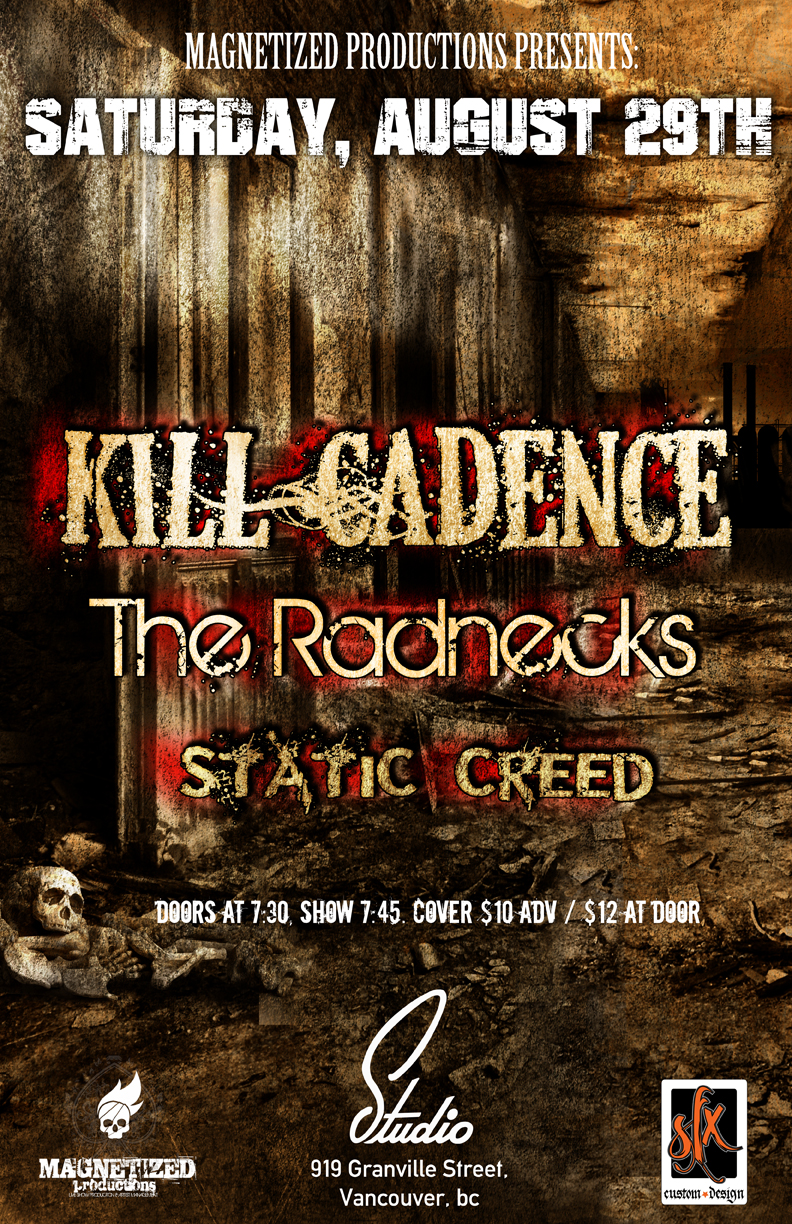 Magnetized Productions presents: Kill Cadence / The Radnecks / Static Creed. Saturday, August 29th at Studio Records, (919 Granville Street, Vancouver, BC). Doors at 7:30, Show 7:45. Cover $10 Adv / $12 at Door.