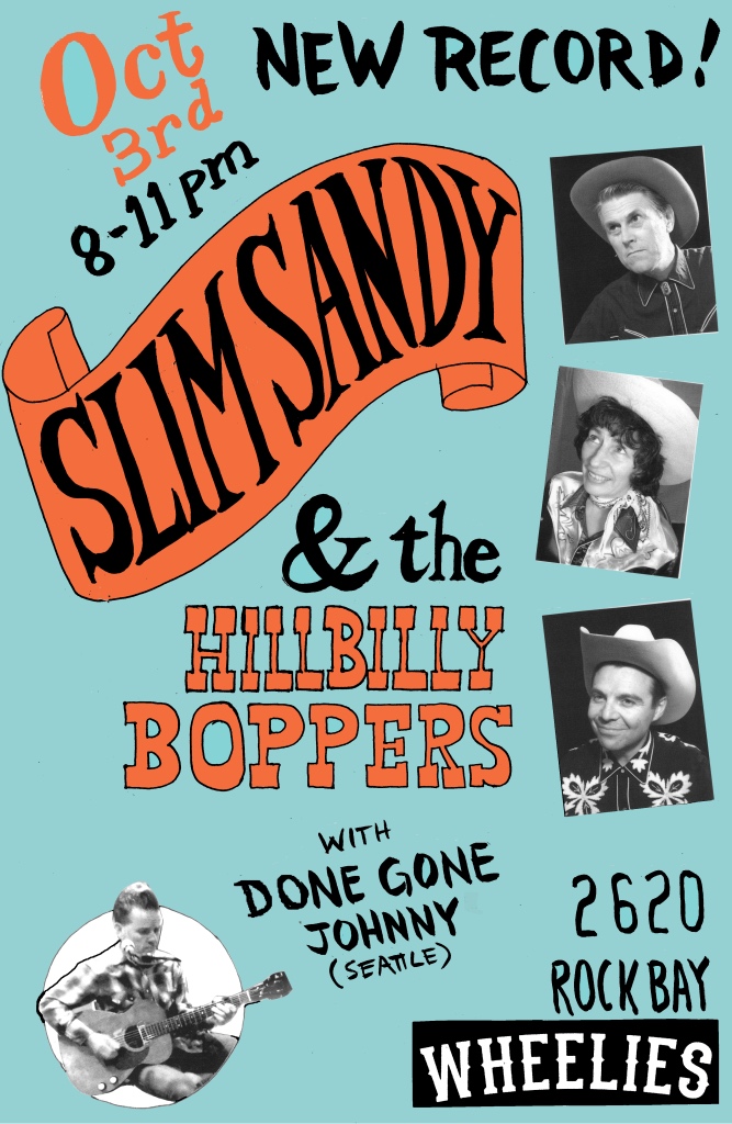 Slim Sandy and the Hillbilly Boppers are pleased to launch their brand new 45 RPM record, featuring the songs "SWEET ROCKIN MAMA" and "I'M READY", on October 3 at Wheelies 2620 Rock Bay). Opening act DONE GONE JOHNNY from Seattle will perform his one man rockin band show! Don't miss this rockin night of music!