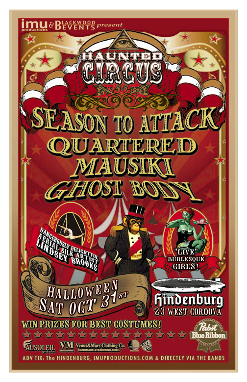 . Saturday, October 31st IMU & BLACKWOOD EVENTS present HAUNTED CIRCUS! SEASON TO ATTACK, GHOST BODY, MAUSIKI & QUARTERED @ The Hindenburg, 23 West Cordova . Doors 8pm / Show 9pm. $12 Advance tickets available directly via the bands and online http://www.ticketzone.com/event/HAUNTED-CIRCUS/306307 / Cover $15 @ the door