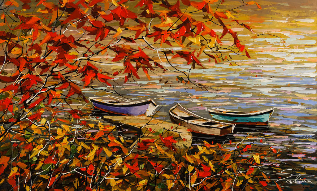 Sabina is captivated by the Canadian landscape painting bright maples, drifting canoes and floral fields bursting with summer colour. Using a palette knife she creates light and texture in her bright paintings.